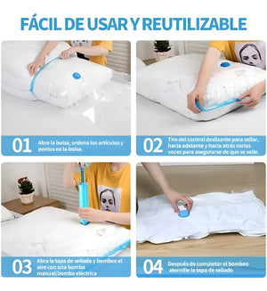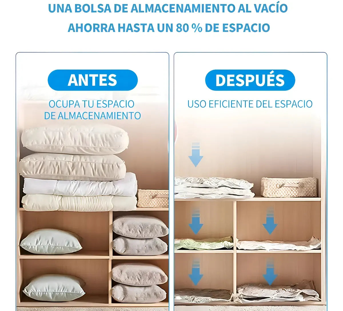 Solo introduce tus prendas, extrae el aire con la bomba incluida y listo: ¡ocupan hasta un 70 % menos espacio! 😍